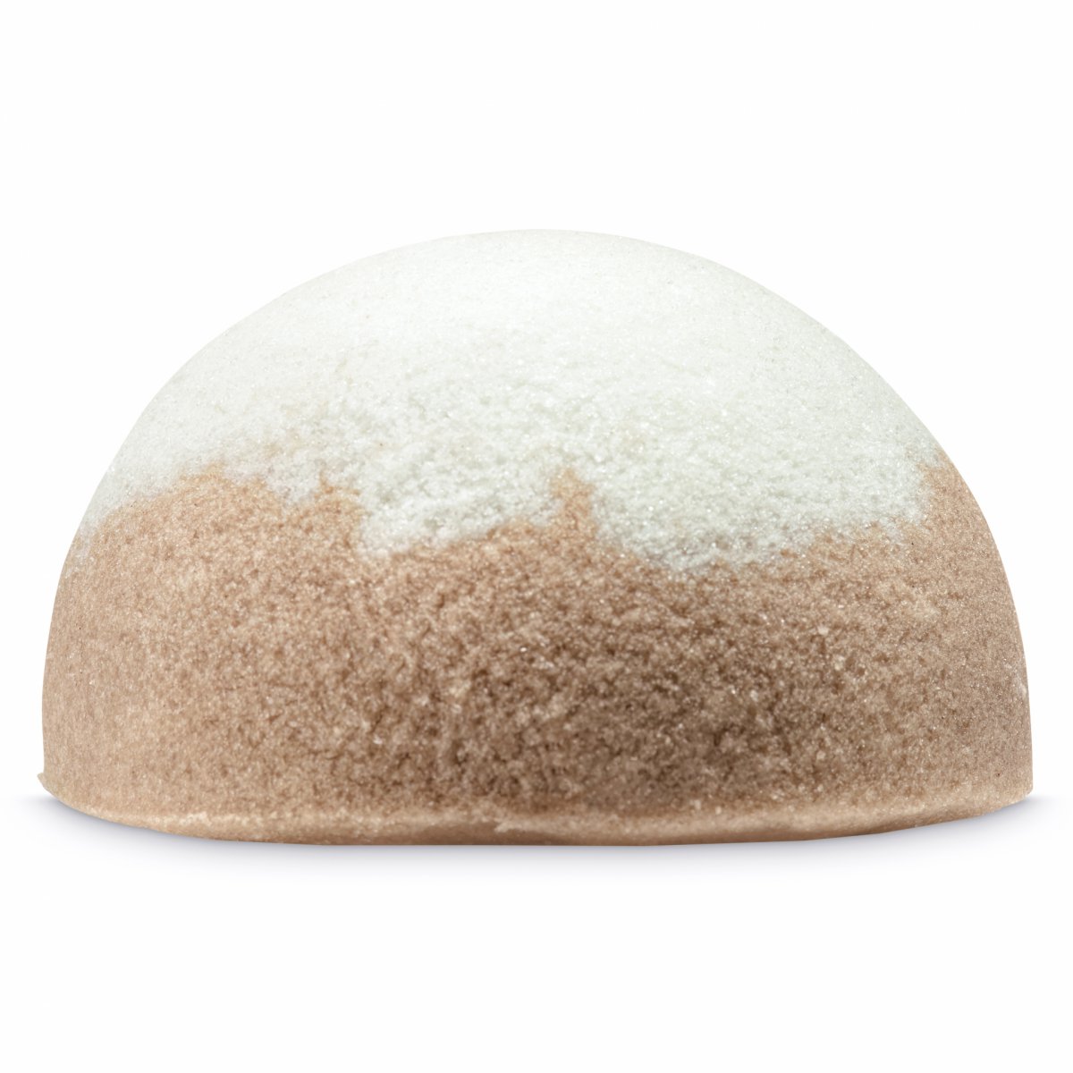 Musujący proszek kąpielowy uformowany w kształt półkuli wypakowany po brzegi odżywczymi dodatkami: nierafinowanym masłem shea, olejem ze słodkich migdałów, olejem z pestek winogron, pełnym mlekiem i olejem ryżowym.