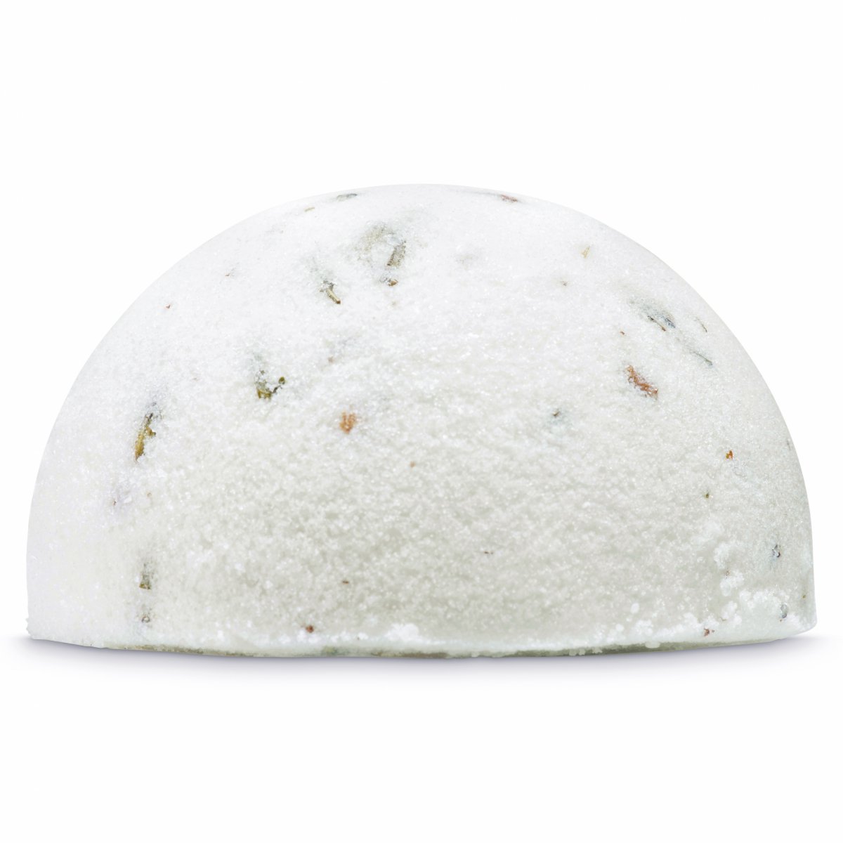 Musujący proszek kąpielowy uformowany w kształt półkuli wypakowany po brzegi odżywczymi dodatkami: suszem i olejkiem eterycznym z lawendy wąskolistnej, nierafinowanym masłem shea, olejem ze słodkich migdałów, olejem z pestek winogron, pełnym mlekiem i olejem ryżowym.