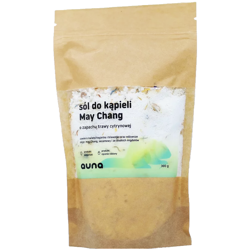 Sól kąpielowa o zapachu trawy cytrynowej zawierająca kwiaty nagietka i bławatka oraz odżywczy olej May Chang, sezamowy i ze słodkich migdałów.