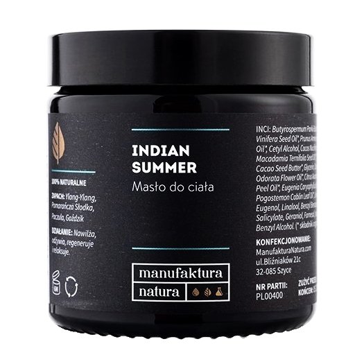 Regeneruje skórę, długo utrzymuje odpowiedni poziom nawilżenia skóry, nie pozostawia tłustego filmu na ciele i szybko się wchłania. Produkt powstał z mieszanki maseł, olejów i olejków eterycznych - doskonale ochroni nas przed niekorzystnym wpływem szkodliwych czynników zewnętrznych, szczególnie zimowym wiatrem czy mrozem.